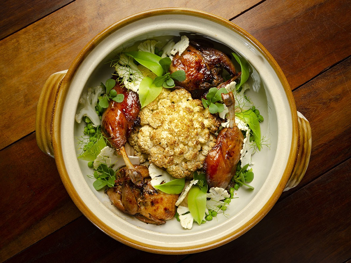 – Duo de Aves: codorna recheada com cogumelo, baru, trufas e passas, coxa de pato assada lentamente, couve-flor assada inteira, purê de couve flor com noisette e ervilhas.