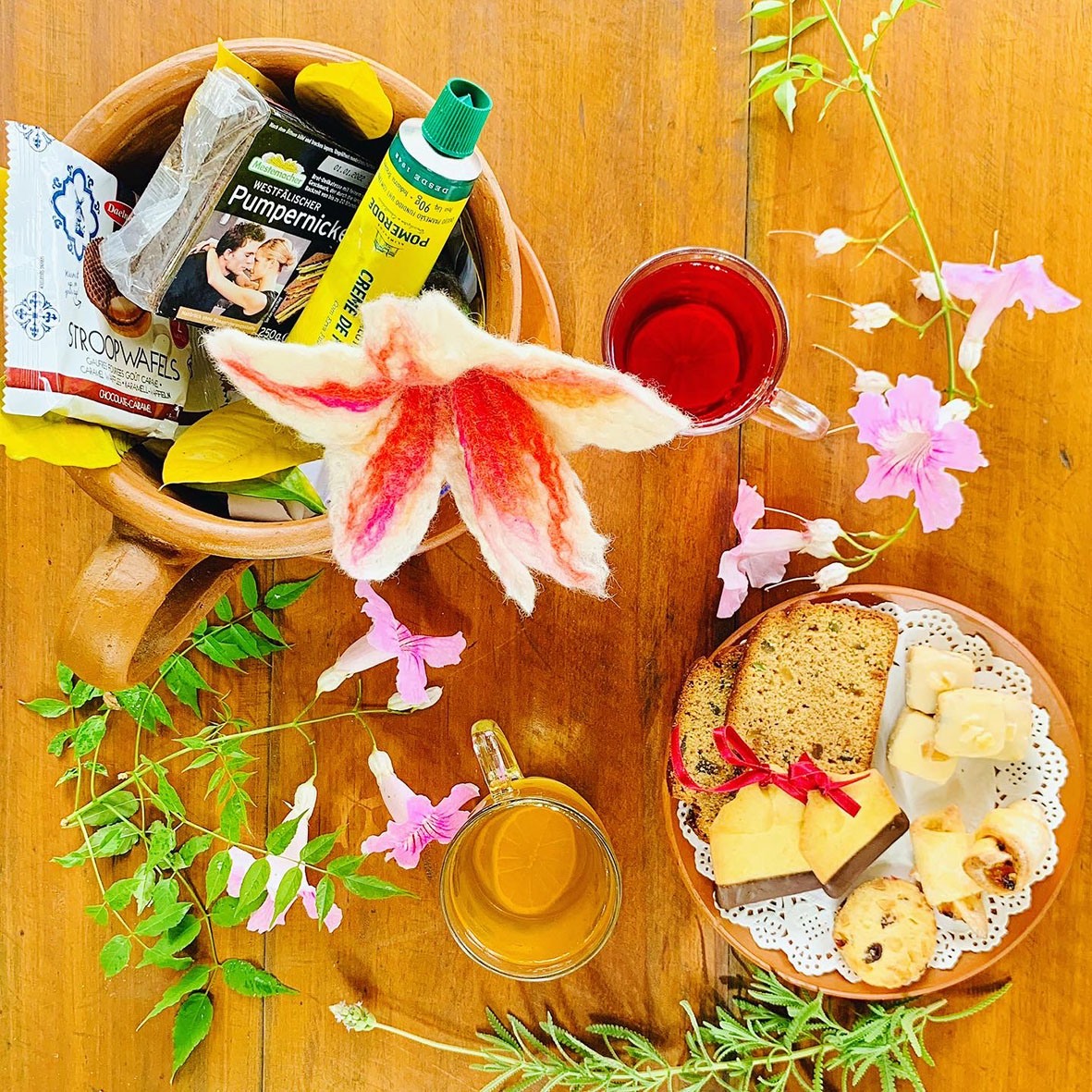 Todos acompanham ervas para infusão Moncloa (Rouge ou Ginger Lemon), um postal, 2 Stroopwafels Daelmans, 1 vidro de mel (10g), sementes com instruções para plantio e 1 flor em lã cardada de Myriam Aguiar.
