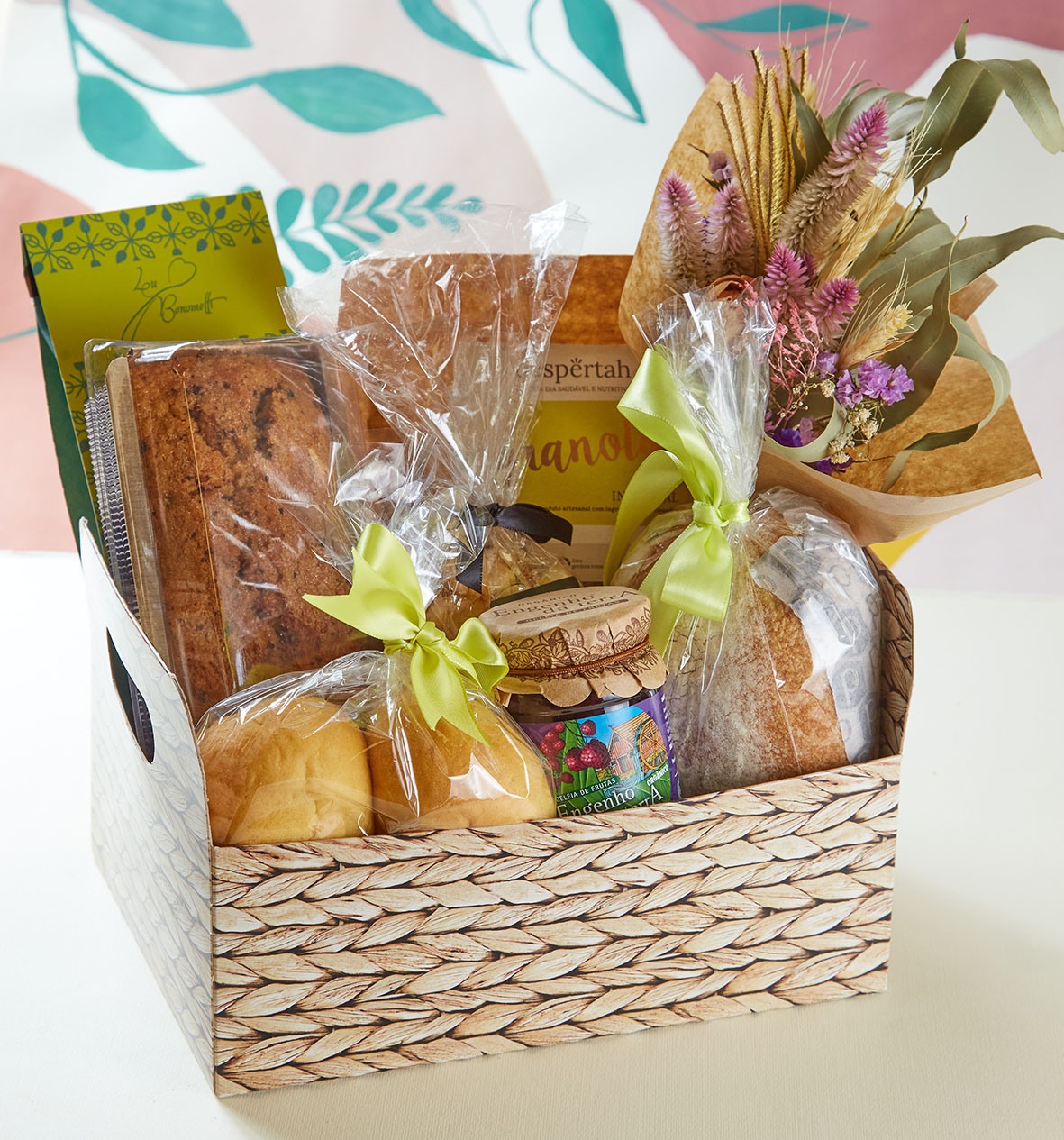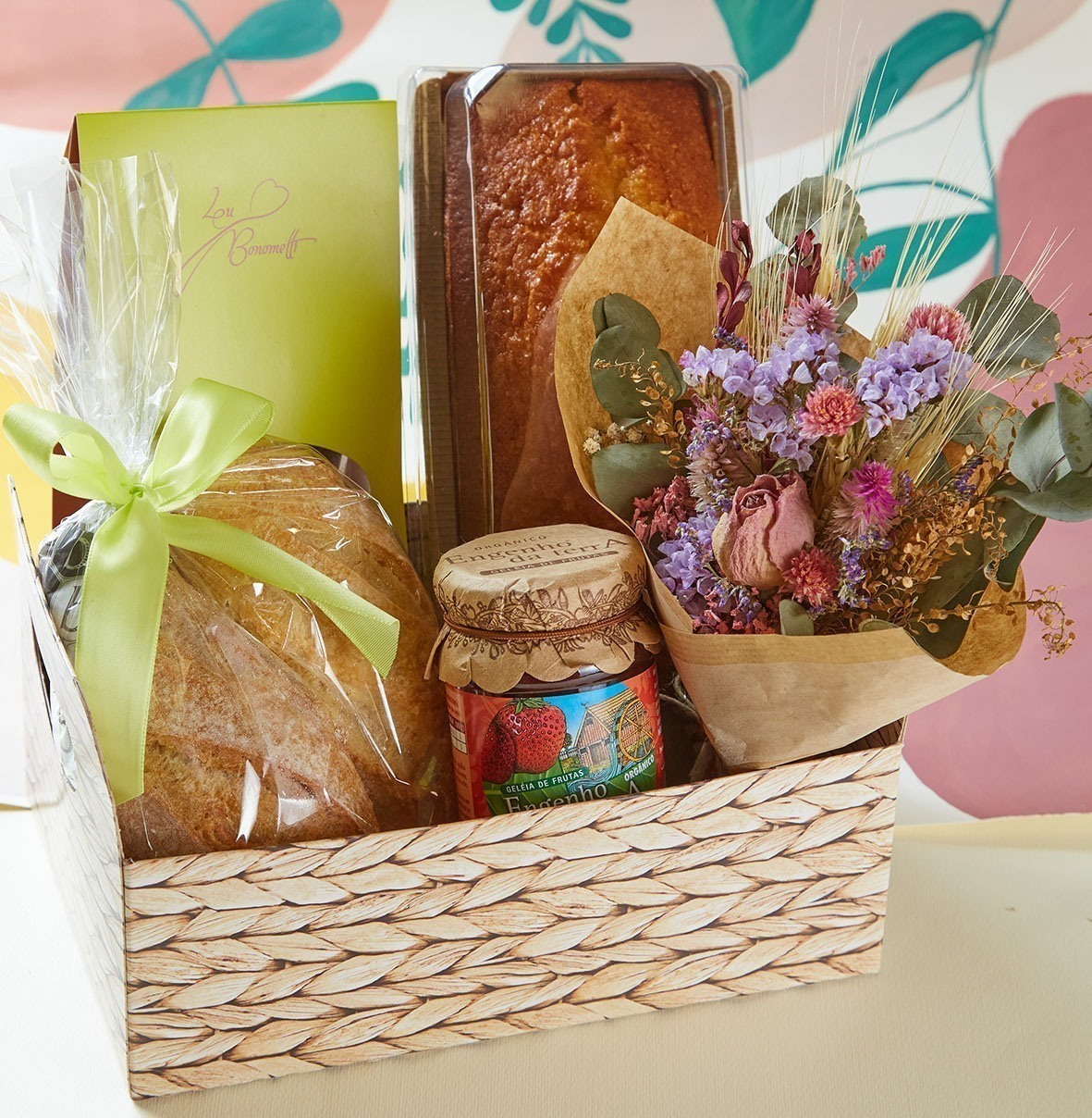 – Cesta Carinho: dois pães de fermentação natural com farinha orgânica (mini Bastone e pão integral pequeno); um bolo cítrico de laranja e limão; biscoitinhos amanteigados de cacau e canela e uma geleia orgânica de amora ou morango, além de arranjo de flores secas. Custa R$ 95,00.