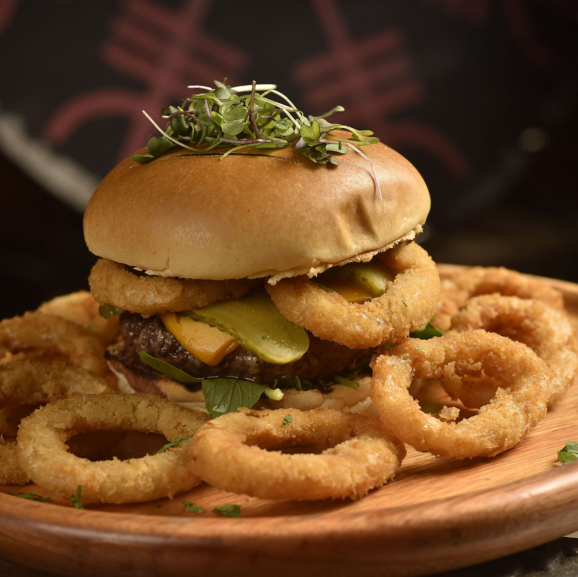 – Erik, o ruivo (R$ 49,90): 180g de carne artesanal coberta com fatias de queijo cheddar, bacon, maioneses de ervas, alface, alface e tomate. Acompanha anéis de cebola;