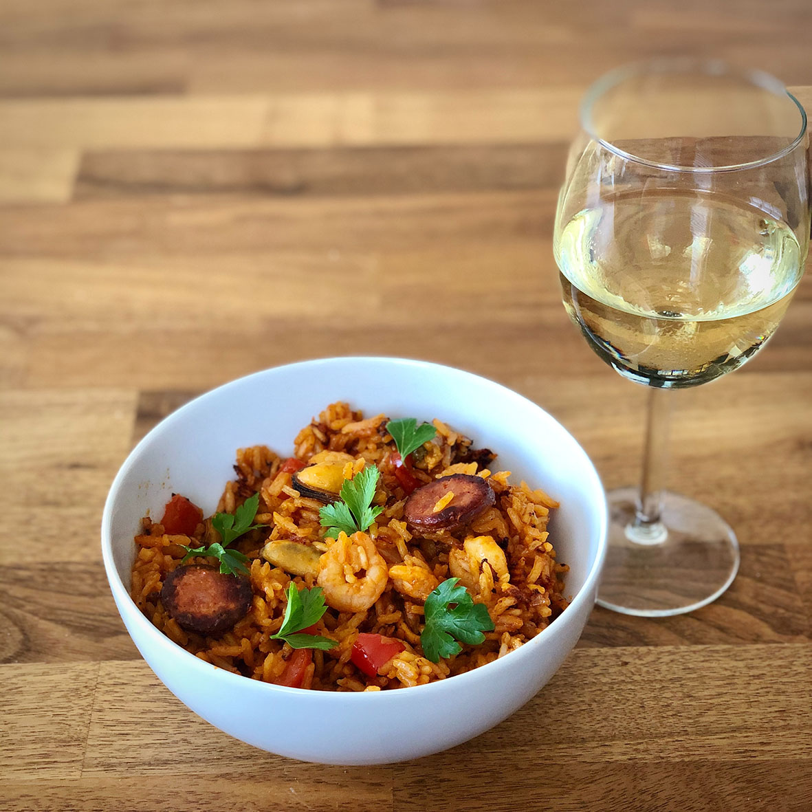 – Prato principal: camarões Rosa GG grelhados ao molho Rosé com Natas e concassê de tomates frescos; Arroz branco com açafrão e amêndoas laminadas tostadas;
