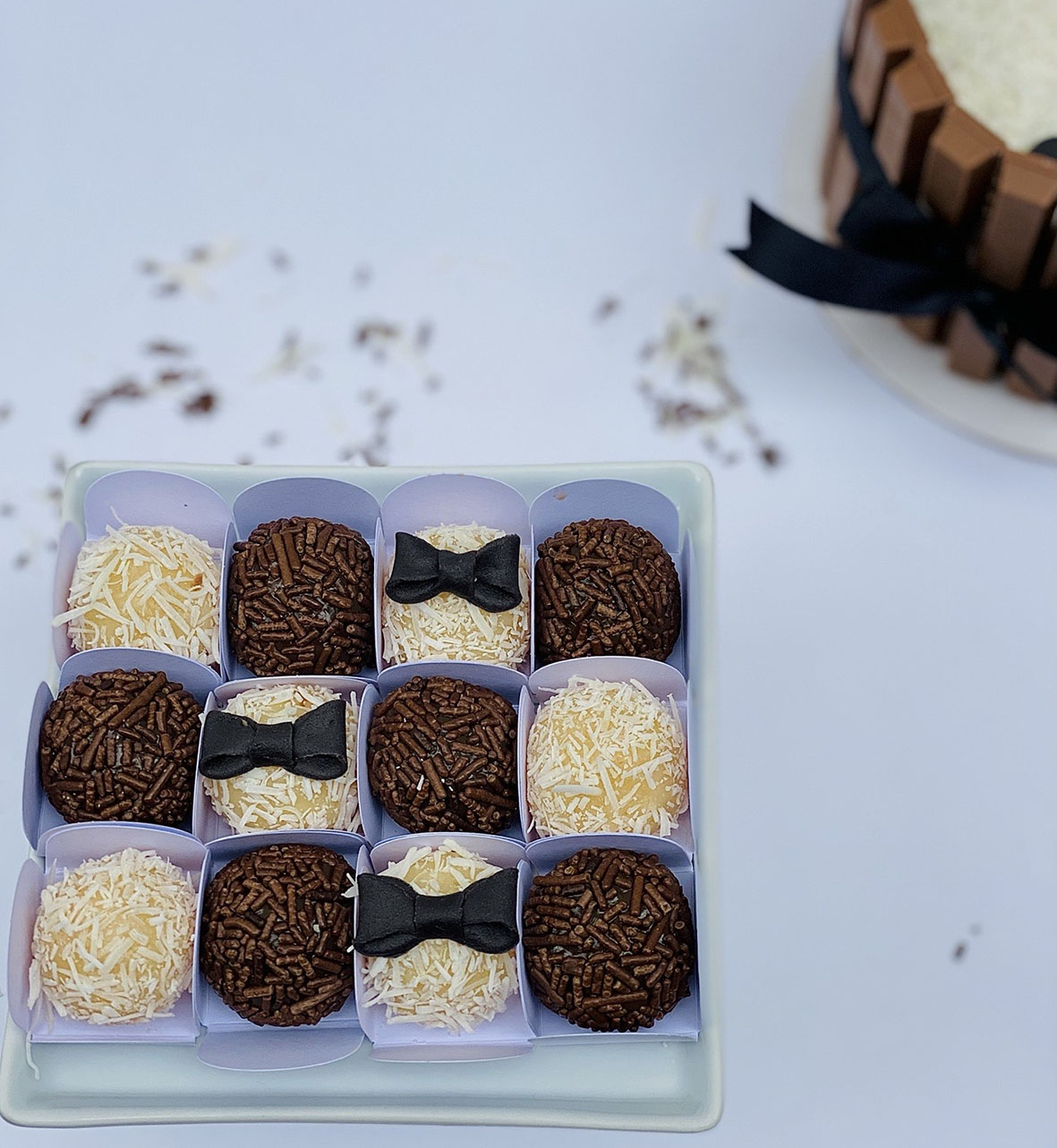 Outras opções são as caixas de brigadeiro O Cara (R$ 34,80) com 6 brigadeiros tradicionais e 6 de Ninho, com detalhes de bolinha coloridas feitas de açúcar; a Meu Herói (R$ 34,80) com 6 brigadeiros tradicionais e 6 de brigadeiro branco, detalhes de estrelinhas coloridas feitas de açúcar e Ele Arrasa (R$ 34,80) com 6 brigadeiros tradicionais e 6 unidades de beijinho, com detalhes de gravatinha de pasta americana.