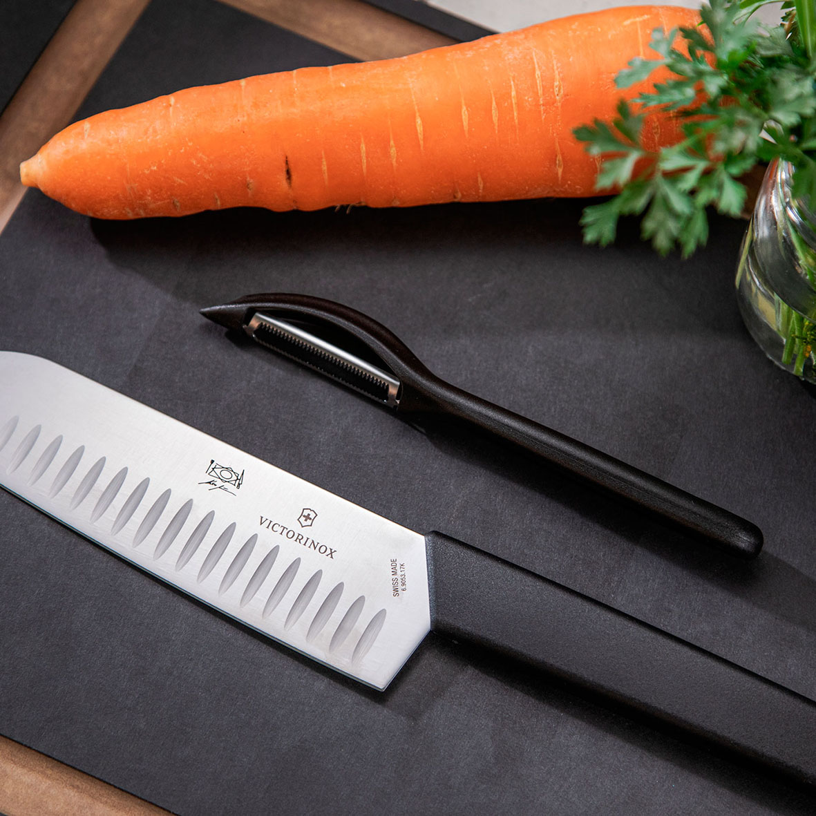 – Kit Santoku + Descascador (R$ 435,00): faca Santoku Swiss Modern, ideal para cortar com precisão e sem esforço vegetais, frutas e carnes, e o descascador universal;