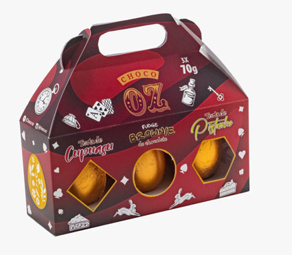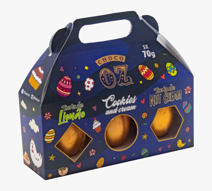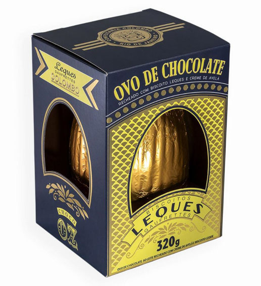 – Ovo Confeitaria Colombo: chocolate ao leite, Biscoitos Leques Grafuettes e creme de avelã com chocolate.