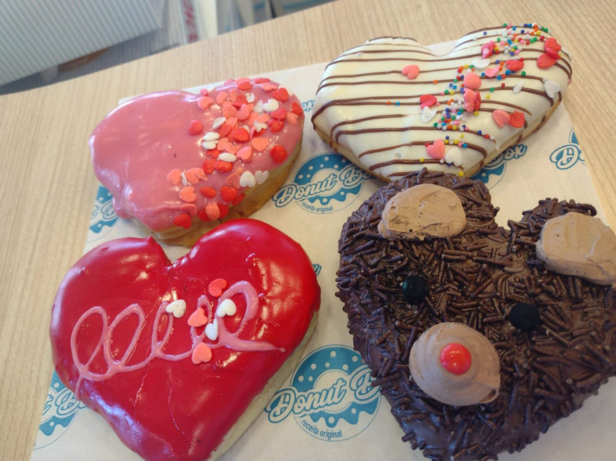 Na casa localizada em Curitiba, o Valentine’s Day vem em formato de ação. Amanhã a rede terá quatro lançamentos para a data e uma promoção para quem quiser aproveitar com o par. Os lançamentos são os donuts em formatos de coração e de coração com ursinho, em sabores recheados como geleia de morango, brigadeiro e creme, além de coberturas de chocolate branco e riscas de chocolate preto, e cor de rosa com confeitos de coração.
