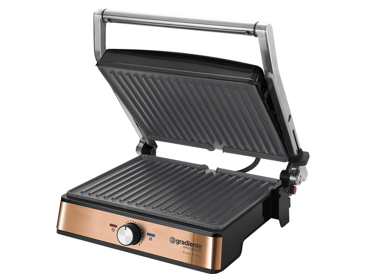 – Grill Press Prime Inox: com alta potência e controle de temperatura. Abre completamente 180° e permite preparar o dobro de alimentos de uma única vez.