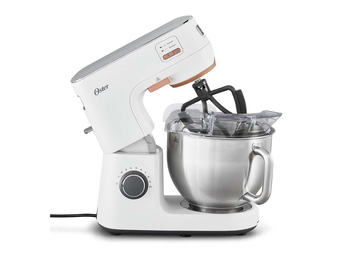A batedeira ainda conta com dez velocidades; motor de 1000 W; bowl de aço inoxidável de 5,2 litros; luz de led; tampa antirespingos e alavanca de inclinação, além de batedor de claras em neve, gancho para massas pesadas, batedor de massas intermediárias e aerados e batedor com borda flexível.