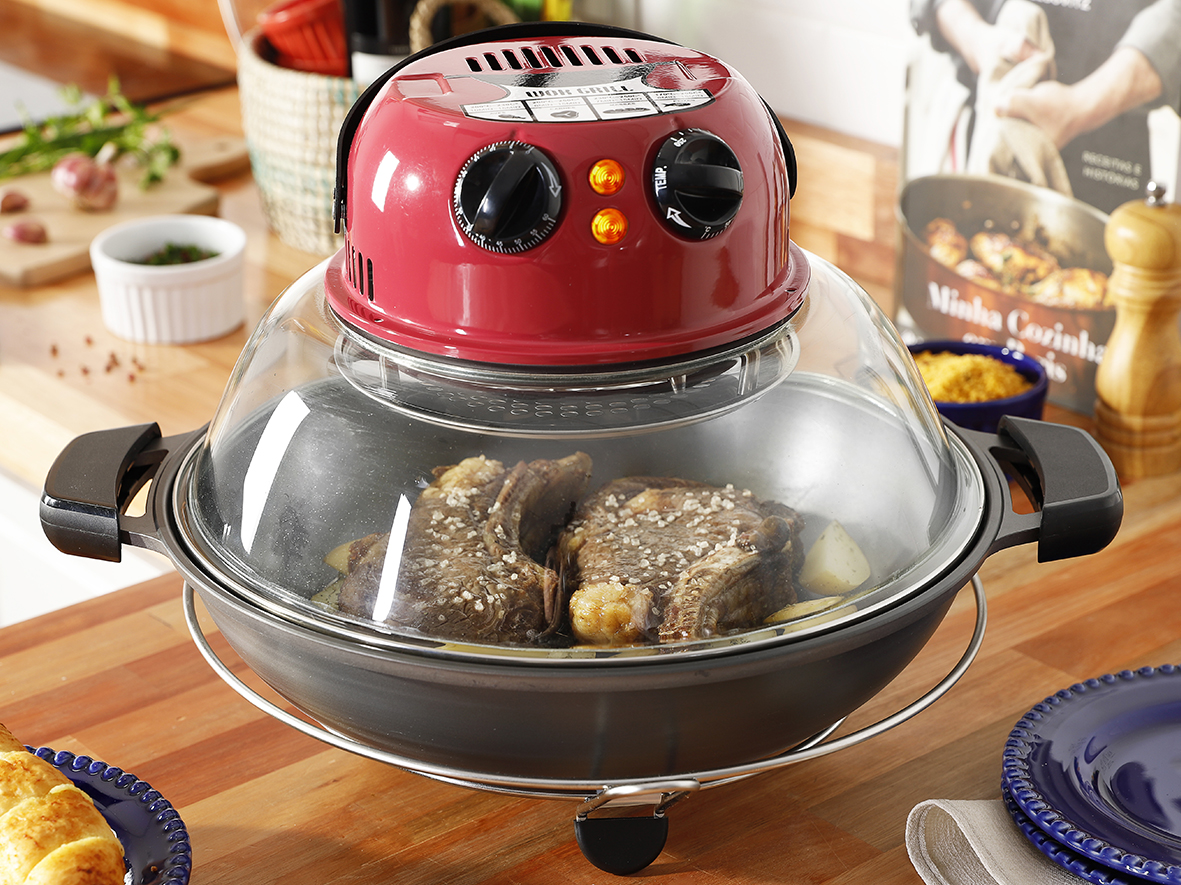 Além disso, a marca alega que o produto é fácil de limpar e tem diversas funções, como forno convencional, micro-ondas, churrasqueira, torradeira, forno elétrico e fritadeira sem óleo.