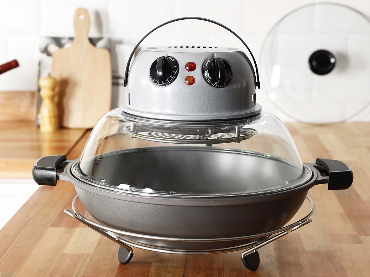 Produzida com tecnologia metalocerâmica, é leve, antiaderente, não descasca e pode ir ao fogão a gás ou elétrico. Assa, grelha, frita com ou sem óleo, cozinha, aquece, desidrata e torra. Voltagem: 110v ou 220v.