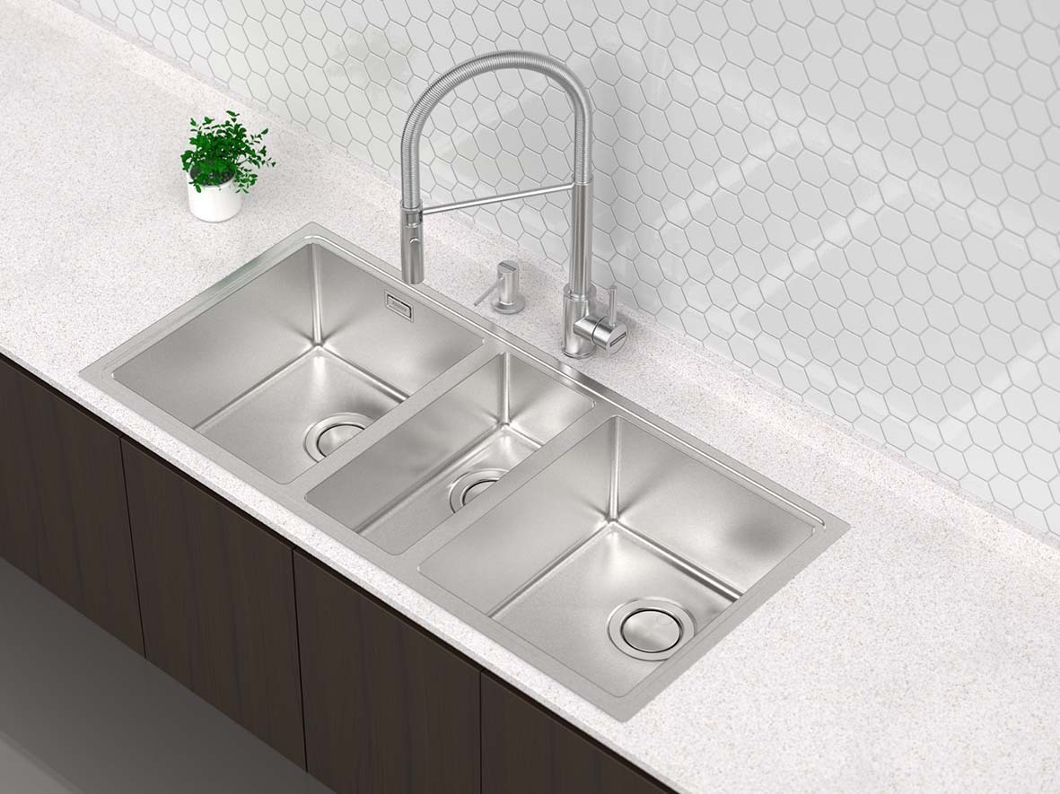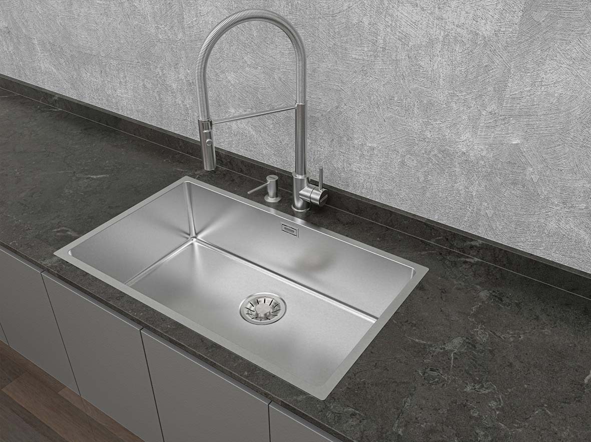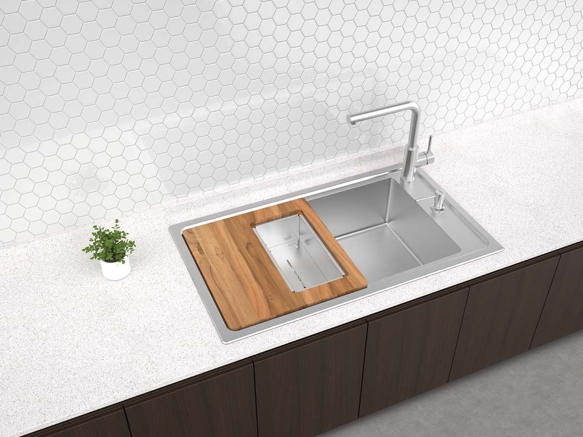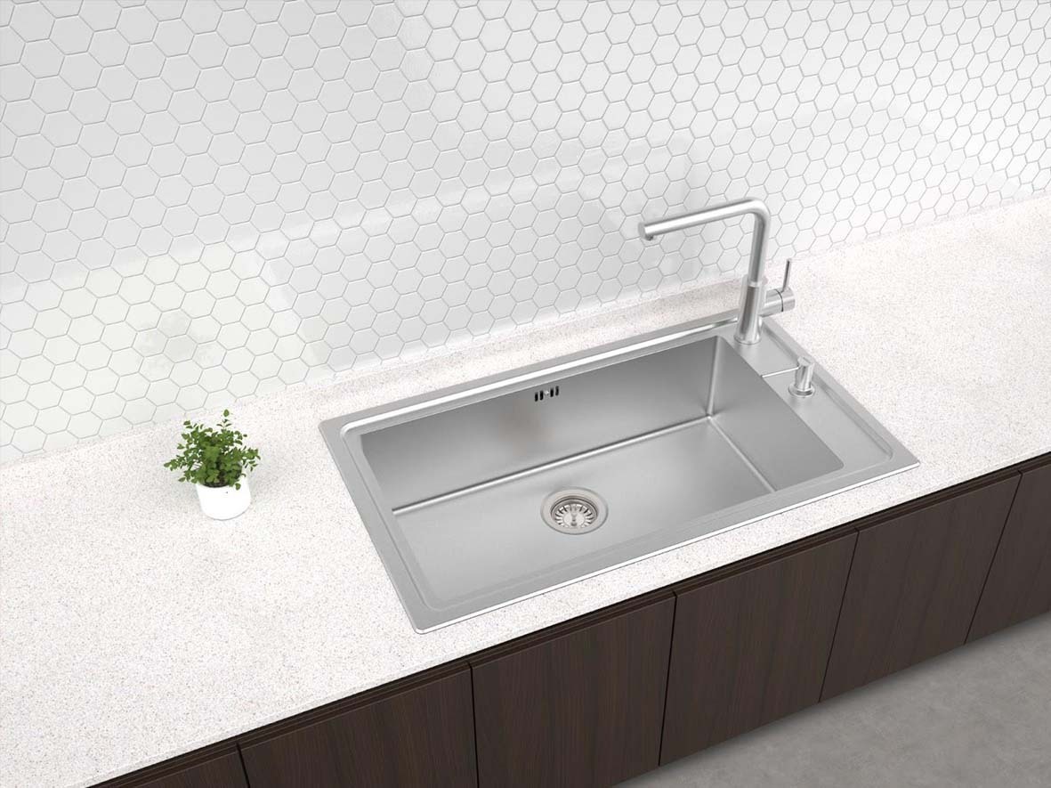 A Quadrum Flush 1C 70 pode ser instalada alinhada à bancada, no modo Flush, e também tem borda única, com furação para o misturador e dosador de sabão direto na peça. Por fim, a cuba Square 86 tem 50cm de largura, a possibilidade de fixar o misturador e o dosador de sabão na lateral da própria cubae kit de acessórios.