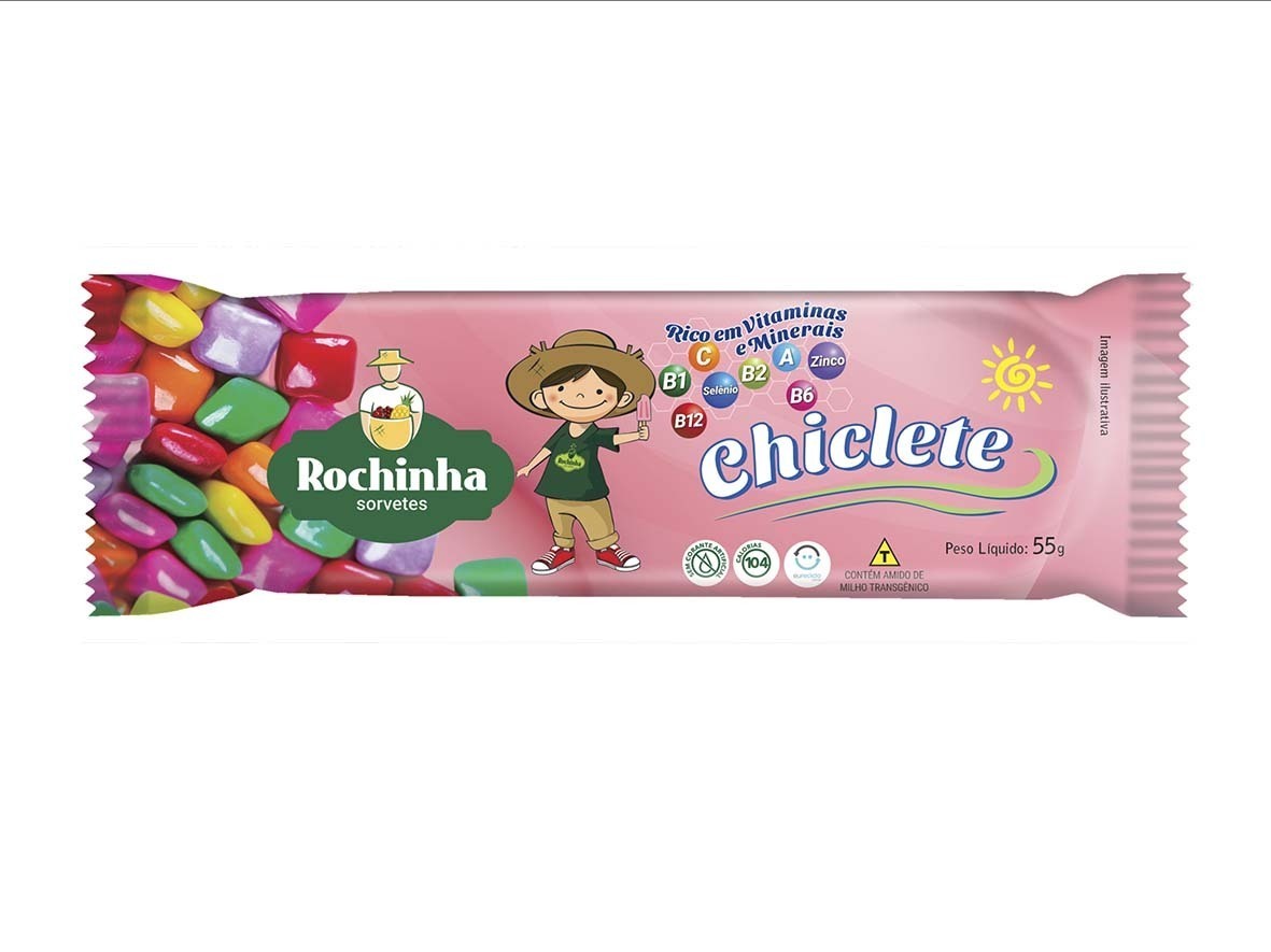 – Chiclete: com recheio de morango e enriquecido com vitaminas e minerais, como a B1, C, B12, B2, A, B6, o zinco e o selênio. O sorvete não tem corantes artificiais.