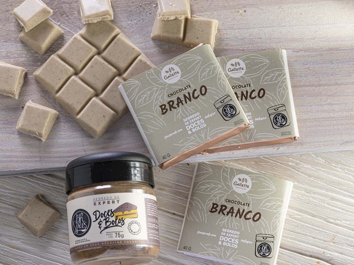 – Chocolate Branco com Segredo de Expert Doces e Bolos: com canela, cravo, gengibre, pimenta-da-Jamaica, cardamomo e noz-moscada.
