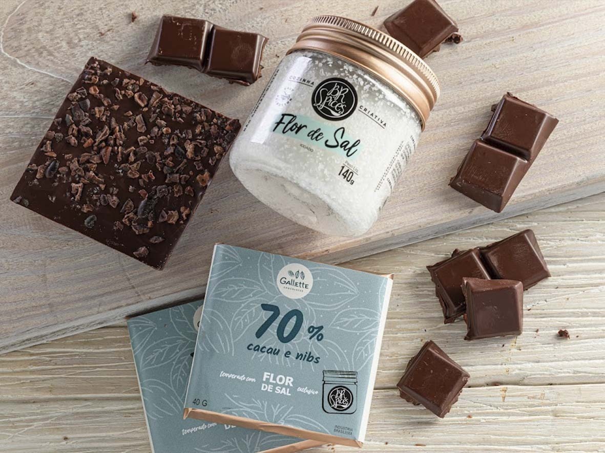 – Chocolate 70% Cacau com Nibs e Flor de Sal: chocolate artesanal bean to bar da Gallette e flor de sal.