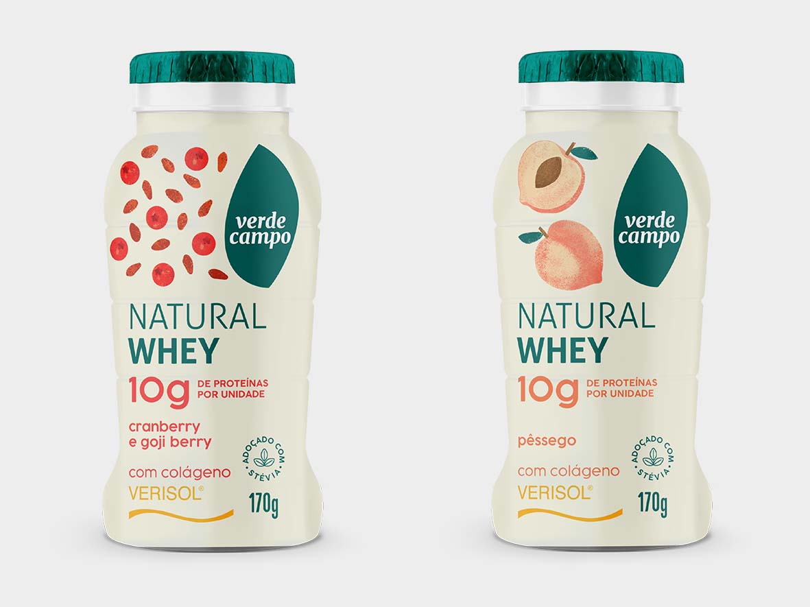 – Natural Whey com colágeno: feito com leite de fazendas certificadas, adoçado com Stevia, tem colágeno Verisol® e 10g de proteína. É zero lactose, zero adição de açúcares e zero gorduras totais. Está disponível nos sabores Cranberry + Goji berry; e Pêssego.