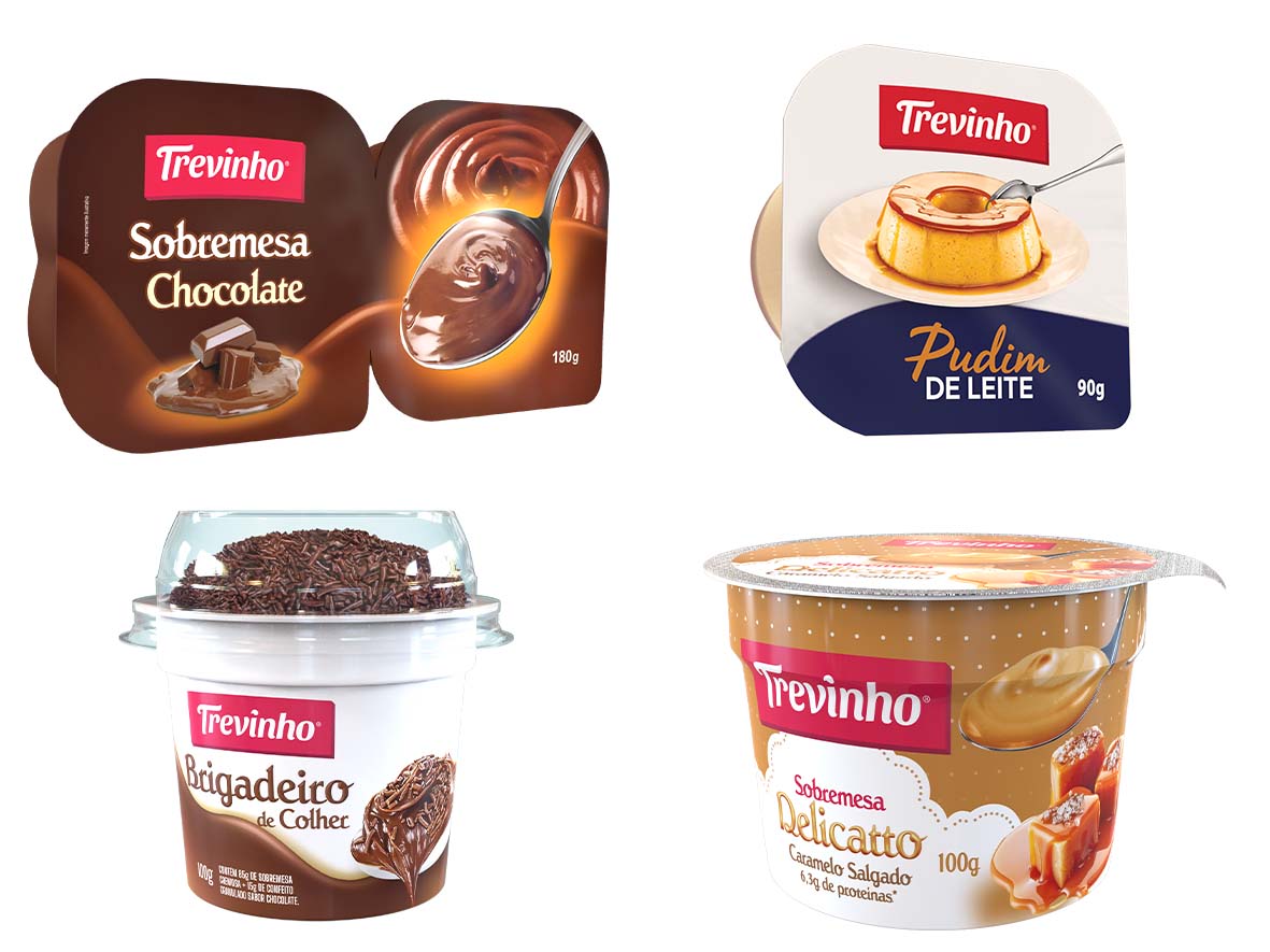 – Trevinho Sobremesa Chocolate: sobremesa láctea a base de chocolate em embalagem dupla.