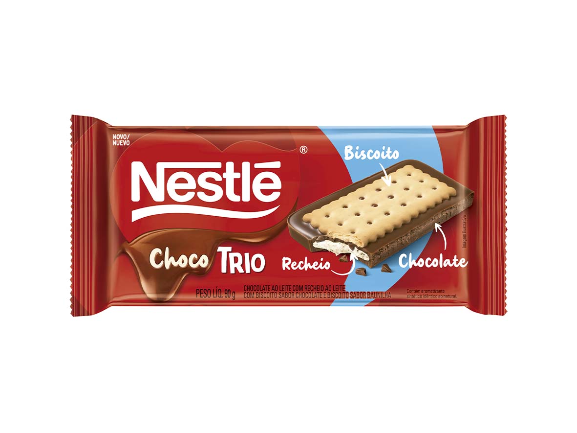 O Choco Trio Nestlé® está disponível em três versões: a de recheio e sabor chocolate, a de recheio de amendoim e biscoito de baunilha e a de recheio ao leite e biscoito sabor baunilha. Cada uma delas tem 90g e preço sugerido de R$ 7,99.