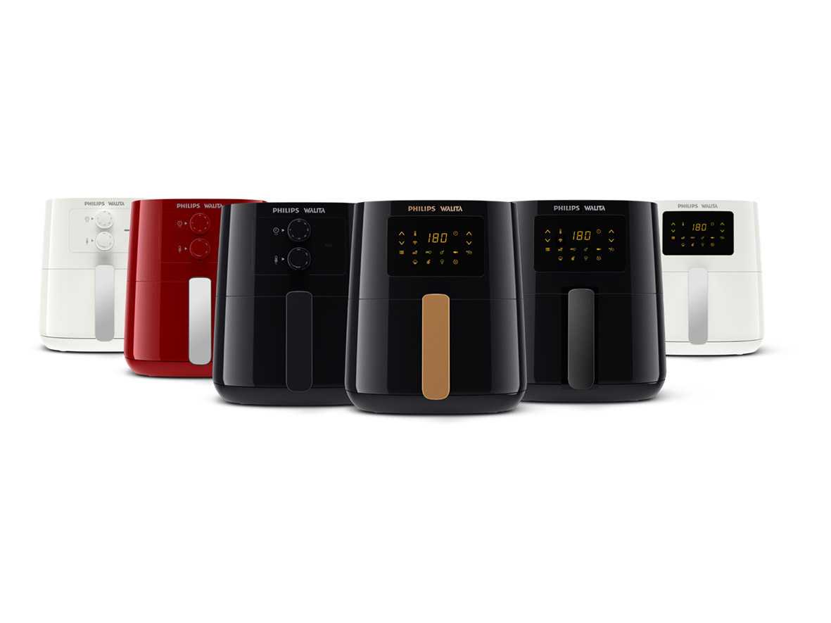 – Airfryer Essential XL Conectada Philips Walita (RI9280): a primeira fritadeira conectada do mercado e que pode ser controlado à distância com o app NutriU por smartphones ou pela assistente virtual Alexa. Tem display touch screen, o aparelho tem tamanho família, capacidade total de 6,2L e capacidade útil do cesto de 4,6L. Conta com sete predefinições, função de Manter Aquecido por até 30