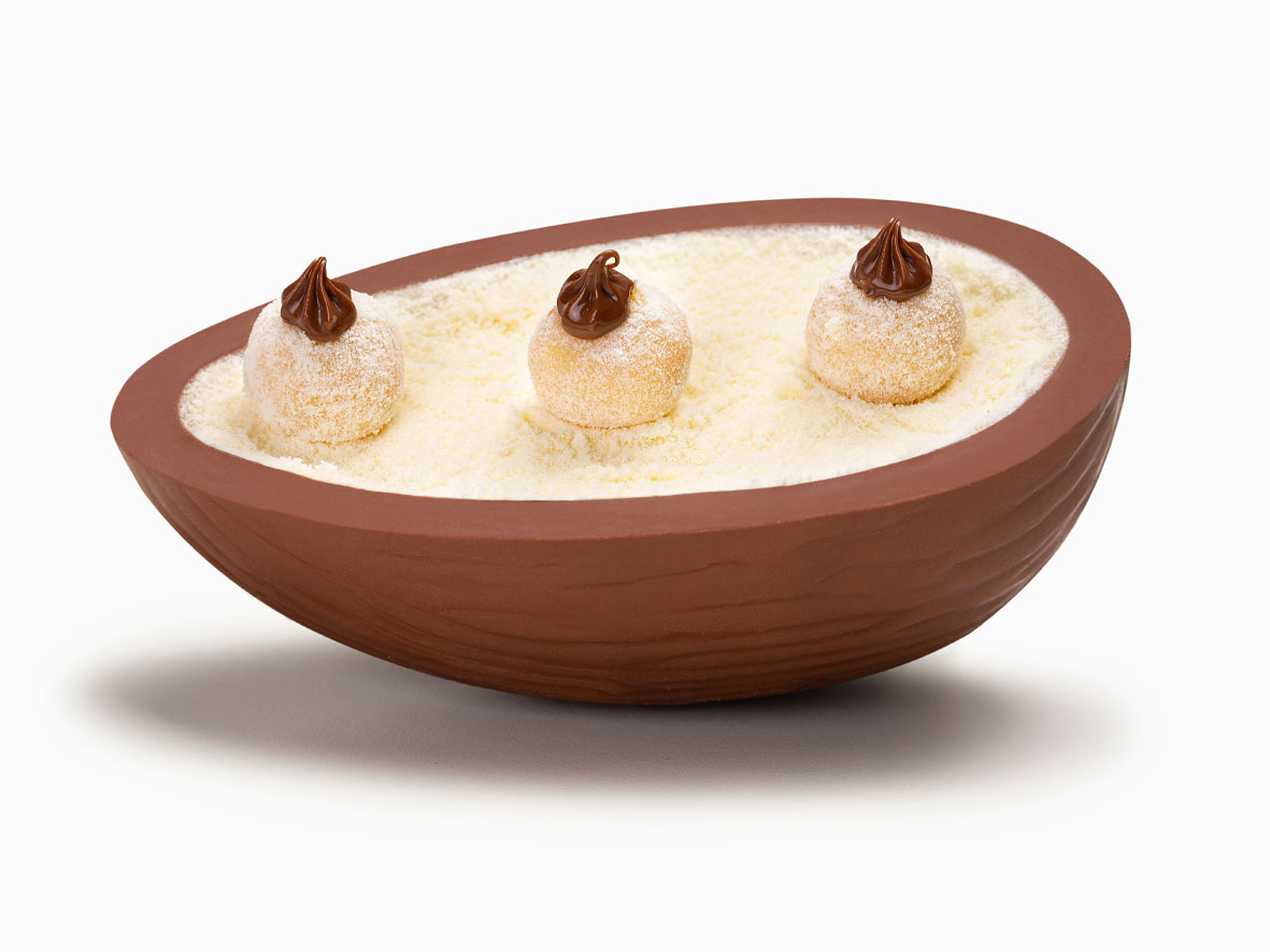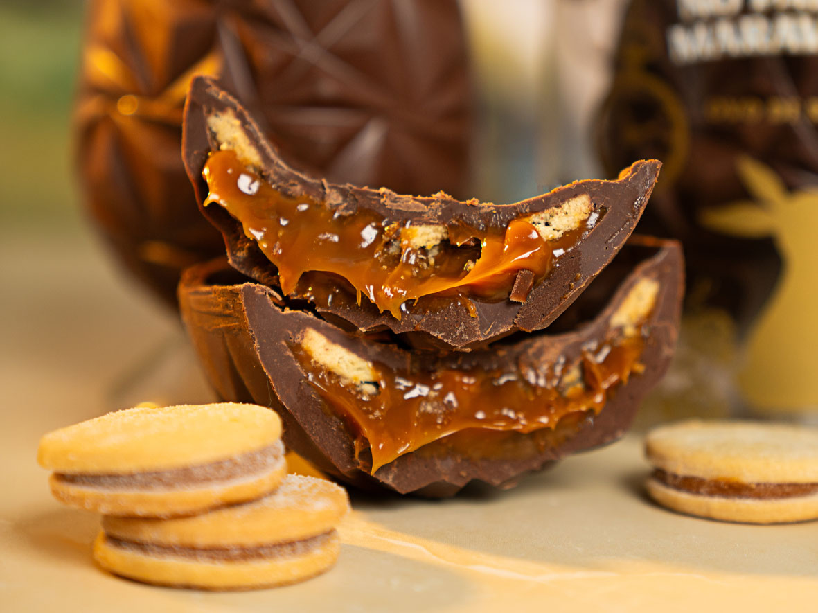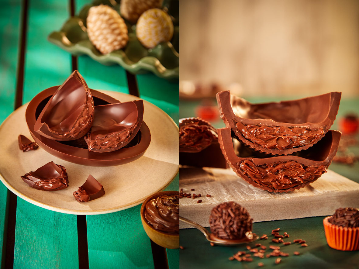 – Ovo Trend Biscoff: ovo de chocolate caramelado recheado com camadas de ganache dourada aveludada e biscoff artesanal crocante.