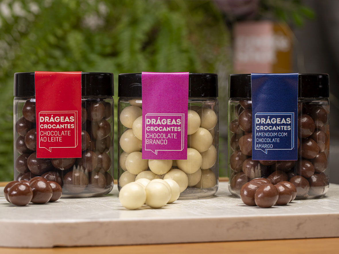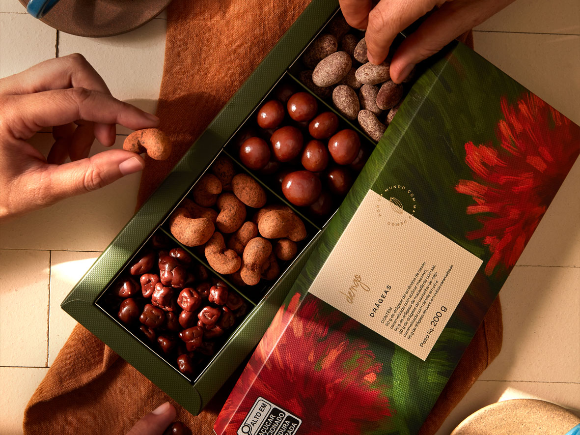 – Caixa de Drágeas (200g | R$ 114,90): com drágeas, uma caixa com macadâmia, amêndoa de cacau, castanha-de-caju e cubos de coco caramelizados.
