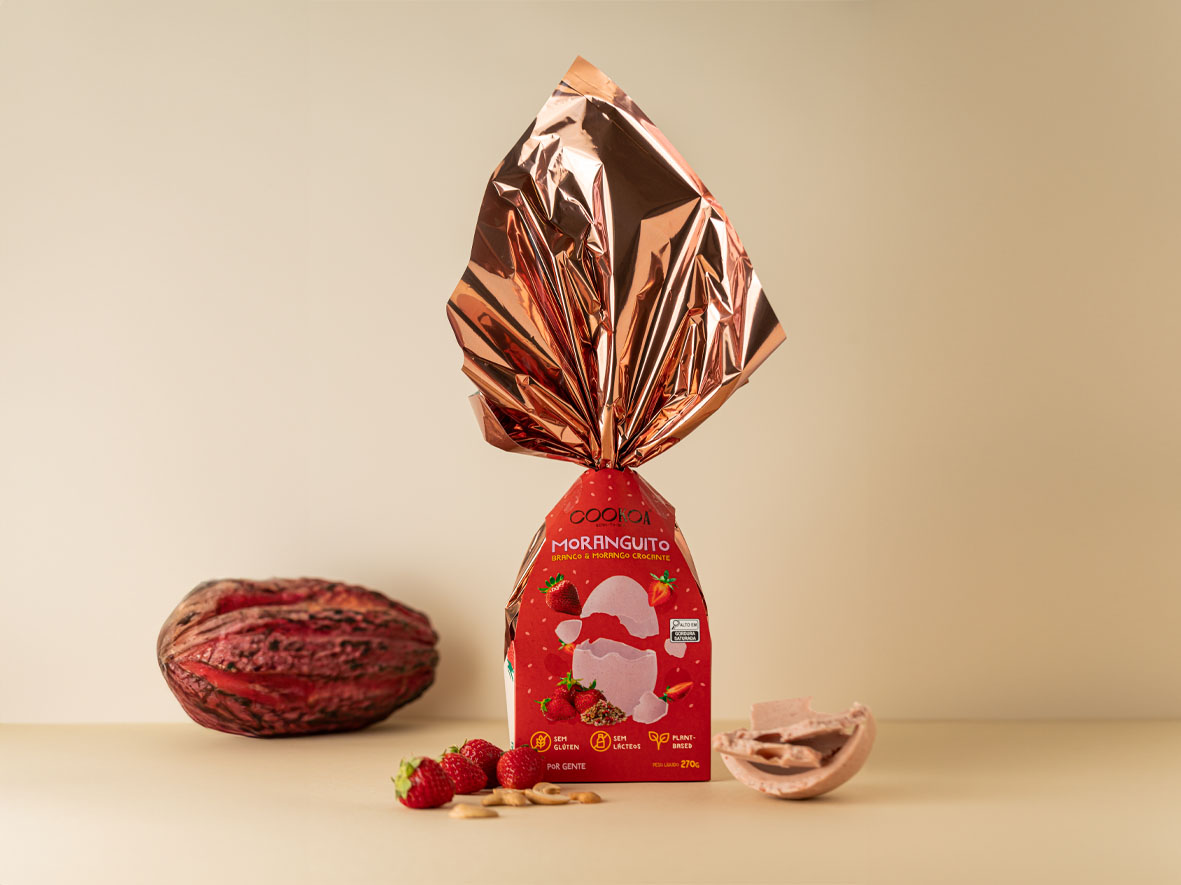 – Ovo de Páscoa Cookoa Moranguito (270g): com a textura e o gosto do morango. Acompanha um pacotinho de flocos crocantes da GranoKids®. O ovo é feito de manteiga de cacau, castanha de caju, açúcar demerara orgânico, fibra de mandioca, polvilho de mandioca, coco, flocos de morango, morango liofilizado, sal integral e extrato de alecrim. Custa R$ 115,00 ou R$ 109,25 no Pix.