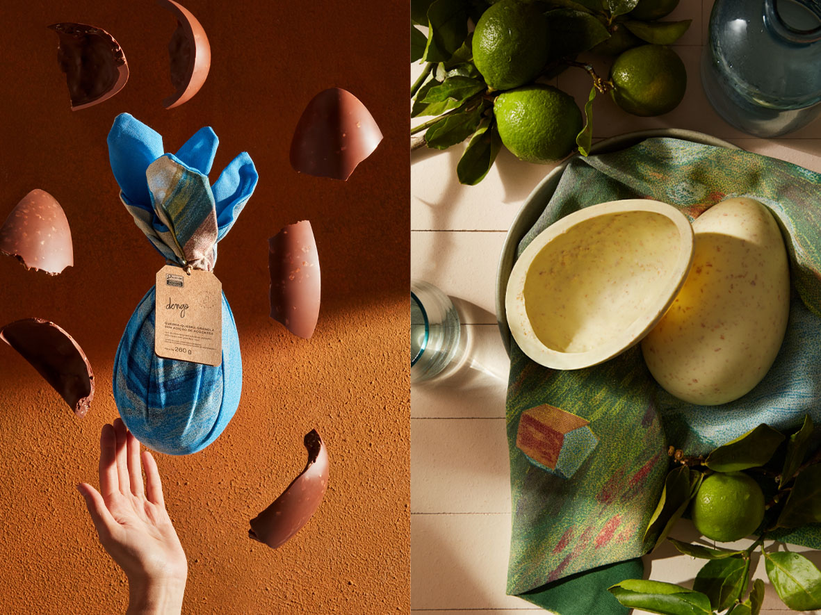 – Ovo Cafuné nas versões 38% cacau (126g | R$ 79,90) e 50% cacau (126g | R$ 79,90), acompanha drágeas crocantes coloridas pintadas com pigmentos naturais à base de frutas e vegetais.