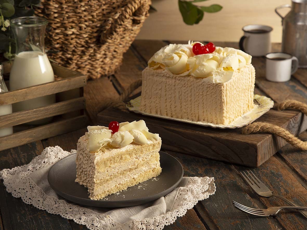 O Delícia de Leite II tem massa branca, recheio de mousse branca com leite em pó, cobertura de mousse branca, raspas de chocolate, leite em pó e cerejas na decoração.