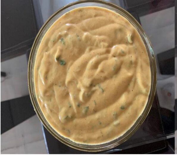 Bata no liquidificador o inhame, o sal a cúrcuma e o extrato vegetal aquecido até formar um creme homogêneo. Acrescente as ervas desidratadas e misture delicadamente.