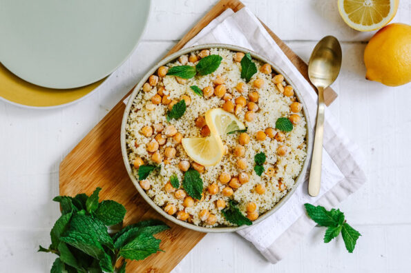 Adicione água fervente, misture e deixe o cuscuz hidratar por cerca de 5 minutos. Junte o grão-de-bico ao cuscuz hidratado, mexa bem e transfira a mistura para um prato. Finalize com suco de limão e folhas de hortelã.