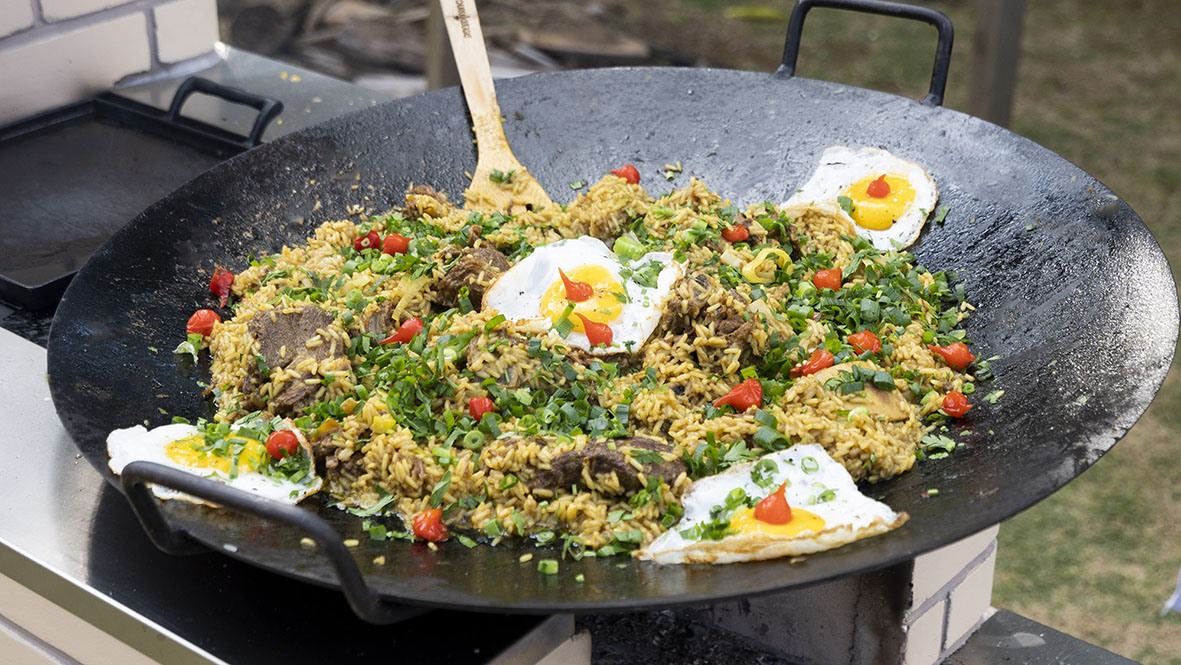 Numa panela grande ou disco de arado, coloque um fio de azeite para fritar o alho picado, acrescente o arroz e refogue. Pegue a panela com a costela cozida e adicione tudo na panela do arroz. Adicione a pimenta e o alho poró. Corrija a água se estiver secando. Frite os ovos para finalizar o arroz de costela.