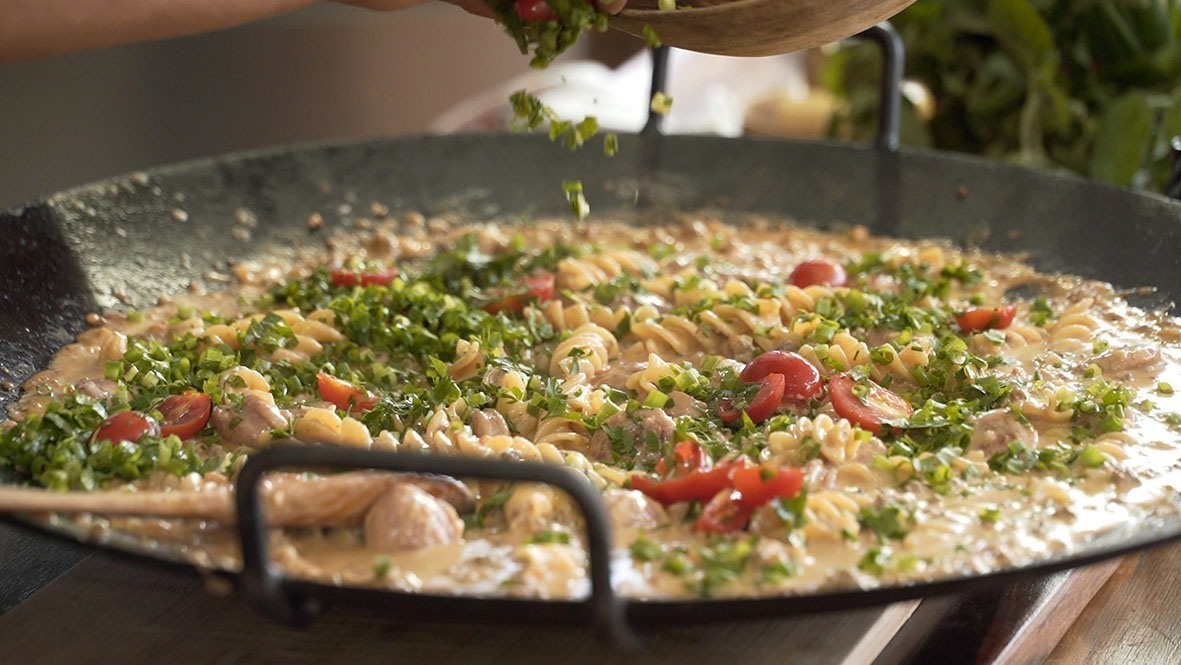 Acrescente o tomate, o manjericão, cebola, o alho e o macarrão. Adicione o leite para cozinhar o macarrão. Misture todos os ingredientes. Coloque requeijão e misture. Finalize com cheiro verde picado, rodelas de tomate cereja e queijo parmesão.