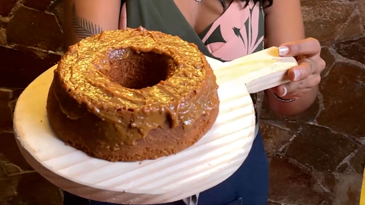 Para que fique ainda mais delicioso, cubra o bolo com doce de leite e coloque um pouco de coco ralado por cima.