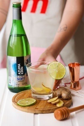 Em um copo longo de 400ml, coloque os ingredientes nesta sequência: gengibre, mel e saque. Macere suavemente para tirar os aromas, depois coloque gelo e complete com água de coco. Após misture os ingredientes com uma colher de bar. Decore com uma fatia de limão siciliano.