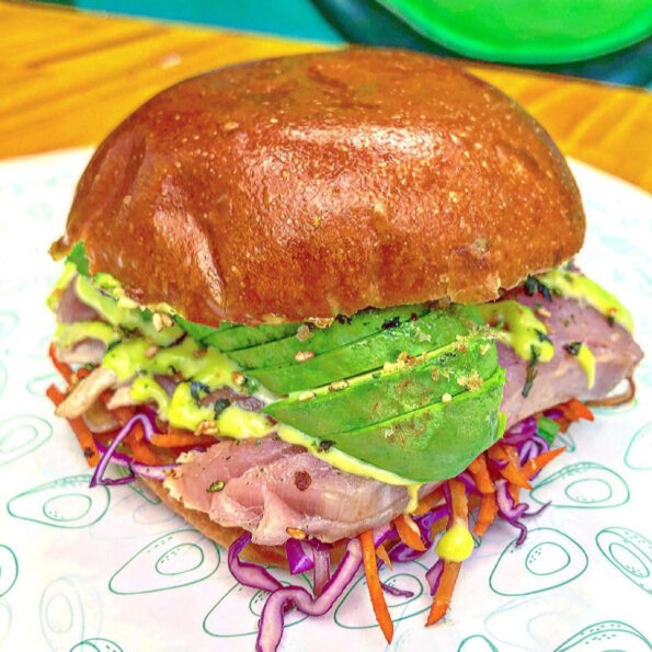 Entre os sanduíches estão o Avoca Ahi Tuna (R$ 36,00), que leva avocado Hass fatiado, atum selado fresco, asian slaw, maionese (wasabi, kewpie ou Sriracha) e furikake (tempero japonês crocante a base de alga marinha e gergelim torrado).