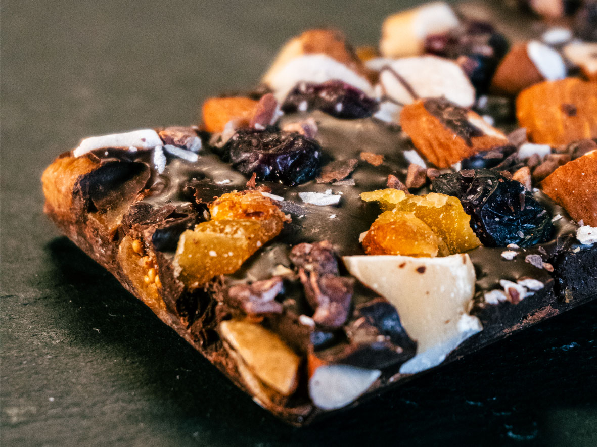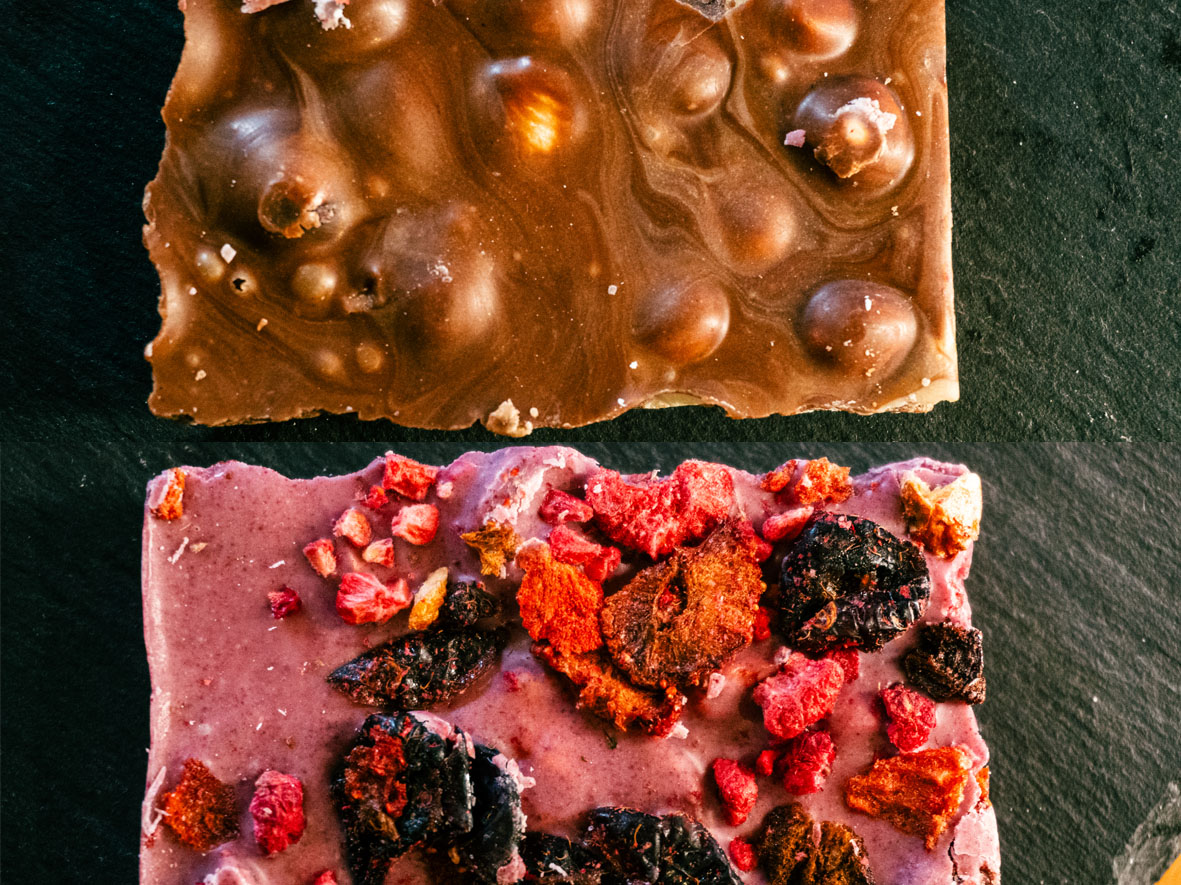As barras trazem entre os ingredientes itens como manteiga de cacau, preparado vegano em pó (leite de arroz, creme vegetal e aromatizante), proteína de ervilha, gordura vegetal, chips de coco, pistache, matcha em pó, morango liofilizado, framboesa liofilizado, cranberry e hibisco em pó.
